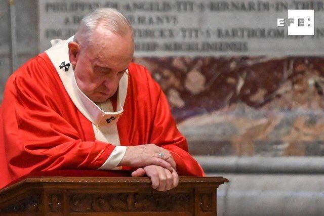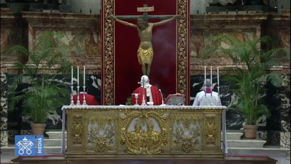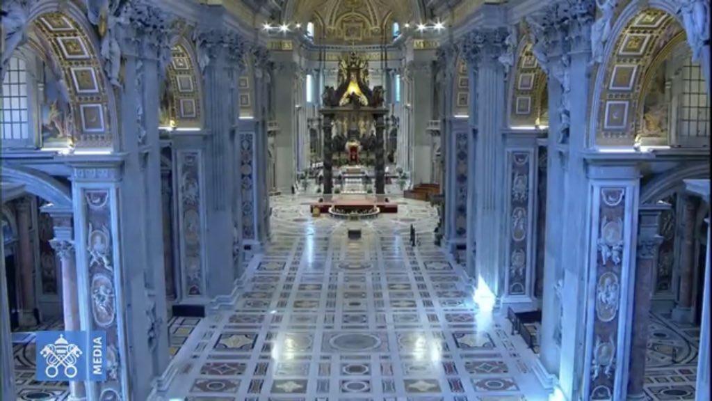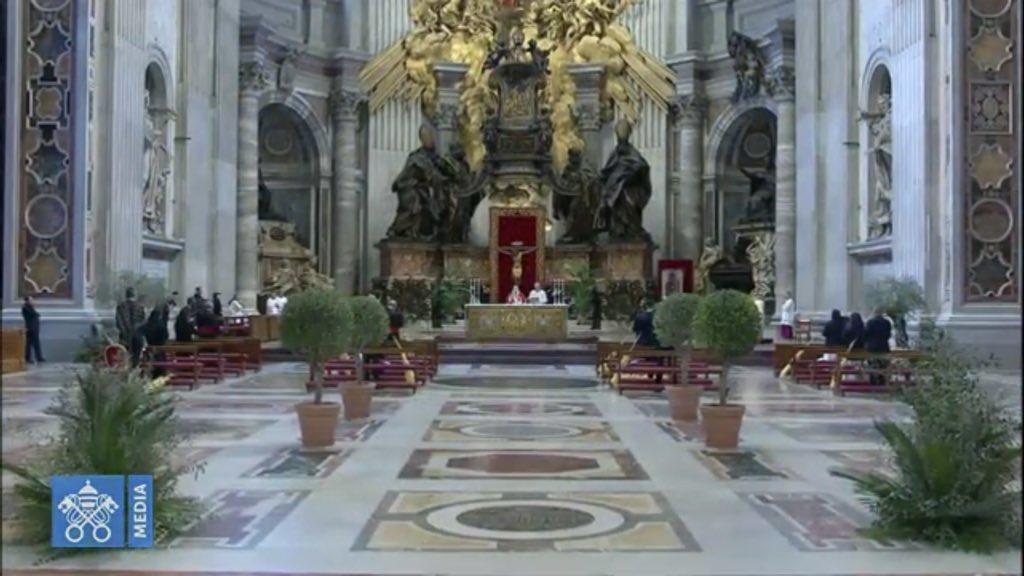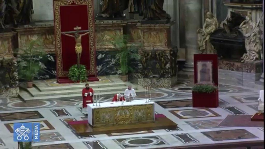 La Eucaristía fue retransmitida en directo por la Santa Sede a través de Internet, como ocurrirá con el resto de las ceremonias de la Pascua que el Pontífice tendrá que presidir sin apenas feligreses debido a la pandemia del coronavirus. Sólo una docena de fieles bien alejados en sus bancos pudieron asistir a la misa de hoy en la basílica vaticana.
