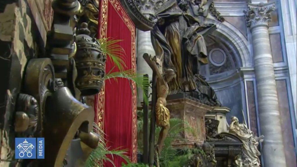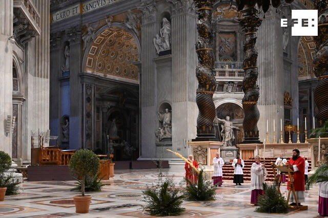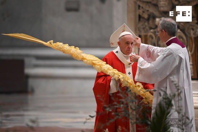 En una basílica de San Pedro vacía y adornada con un humilde olivo y unas pocas plantas, el papa Francisco presidió hoy desde el altar de este templo centro de la cristiandad la misa del Domingo de Ramos, con la que empiezan los oficios de la Semana Santa más difícil y desnuda para los católicos, pues no habrá procesiones en las calles ni se podrá asistir a las iglesias para participar en las liturgias en muchos pa en serio «lo que cuenta» y no perderse «en cosas insignificantes», para «redescubrir que la vida no sirve, si no se sirve».
