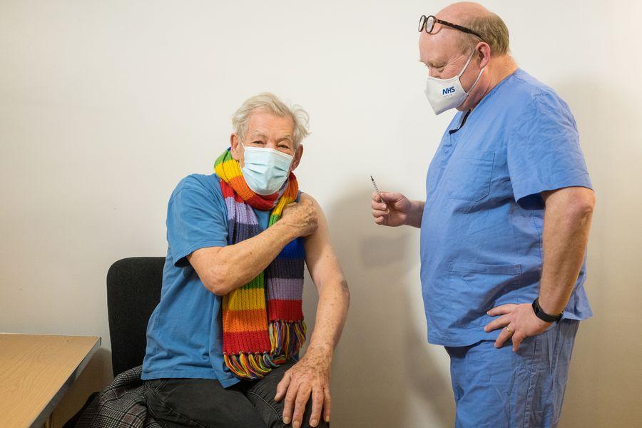 El estatal Servicio Nacional de Salud (NHS, por su sigla en inglés), que está llevando adelante el programa masivo de vacunación de Covid-19 en Gran Bretaña, publicó varias fotos de McKellen, vestido con una camiseta azul y una bufanda a rayas con los colores del arco iris, subiendo el pulgar al recibir la inyección.