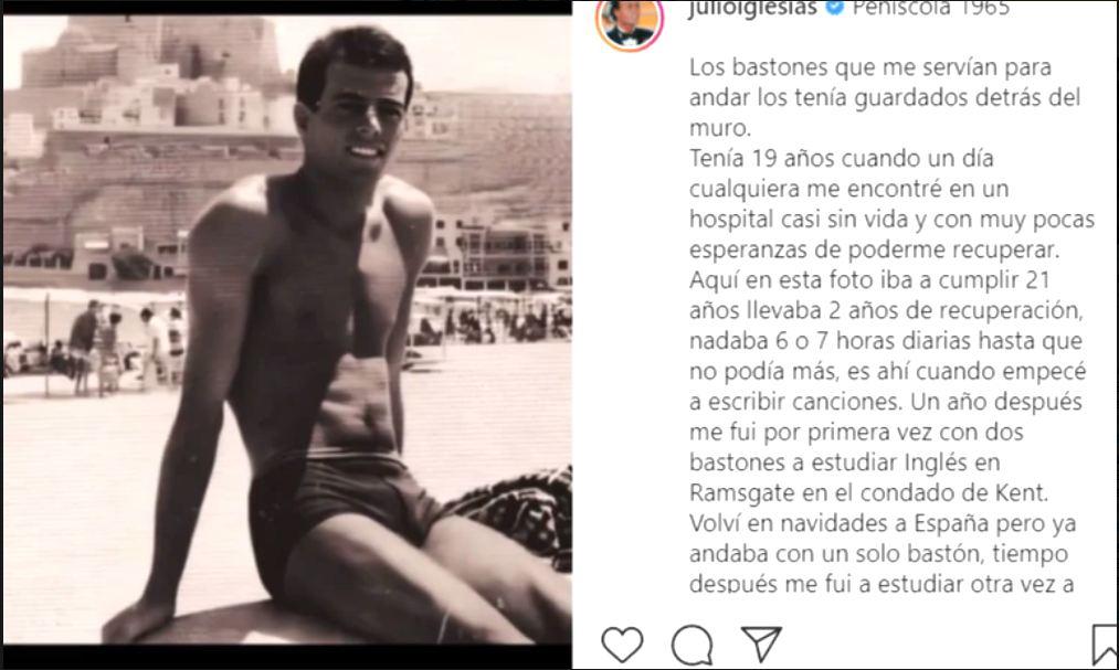 El intérprete compartió en Instagram una imagen de su juventud en Peñíscola [España] que data de 1965. “Los bastones que me servían para andar los tenía guardados detrás del muro. Tenía 19 años cuando un día cualquiera me encontré en un hospital casi sin vida y con muy pocas esperanzas de poderme recuperar. Aquí en esta foto iba a cumplir 21 años, llevaba 2 años de recuperación, nadaba 6 o 7 horas diarias hasta que no podía más, es ahí cuando empecé a escribir canciones. Un año después me fui por primera vez con dos bastones a estudiar Inglés en Ramsgate en el condado de Kent”, empezó el relato el cantante para poner en contexto a sus más de 300 mil seguidores.