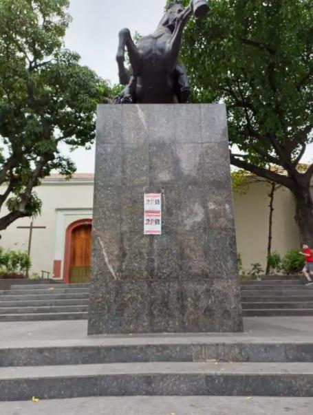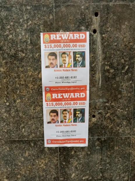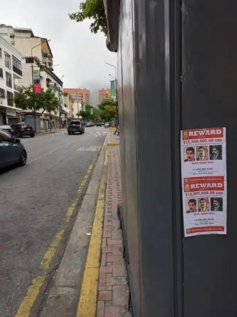 Dichos carteles adheridos en fachadas, kioskos y estatuas, plasman la imagen de recompensa que EEUU emitió contra el dictador venezolano en 2020, cuando la administración de Donald Trump lo acusó de narcotráfico y ofreció 15 millones de dólares por su captura.