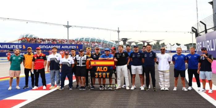 Todos los integrantes de la parrilla, entre ellos el séptuple campeón mundial Lewis Hamilton (Mercedes), el cuádruple campeón mundial Sebastian Vettel (Aston Martin) y el neerlandés Max Verstappen (Red Bull), que está a un paso de revalidar el título -podría hacerlo este mismo domingo, incluso- se fotografiaron junto a Alonso, que portaba un cartel con el número 350 en la recta de meta de Marina Bay, donde el genial piloto asturiano logró dos de sus 32 victorias en la F1 (en 2008, con Renault; y en 2010, con Ferrari).