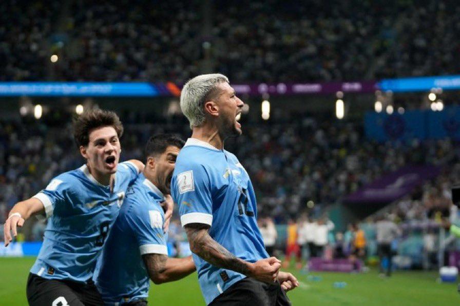 En el minuto 26, Arrascaeta de Uruguay abrió el marcador y marcó el primer gol del partido y seis minutos después, marcó el segundo gol.