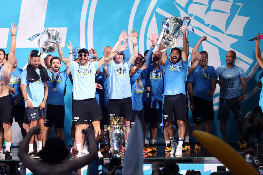 Entre banderas ondeantes y plátanos de plástico inflables, Ruben Dias agitaba el trofeo de la Premier League en uno de los laterales del vehículo, Nathan Ake bailaba con la copa y Jack Grealish se quitaba la camiseta para celebrar los éxitos de la temporada.