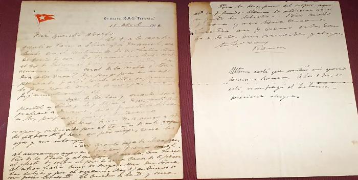 Escrita en papel con membrete y marca de agua de la compañía White Star Line, la misiva contiene dos folios con una mancha de humedad y una nota posteriormente escrita por su receptor que dice: «Última carta que escribió mi querido hermano Ramón. A los 3 días de esta, naufragó el Titanic, pereciendo ahogado».