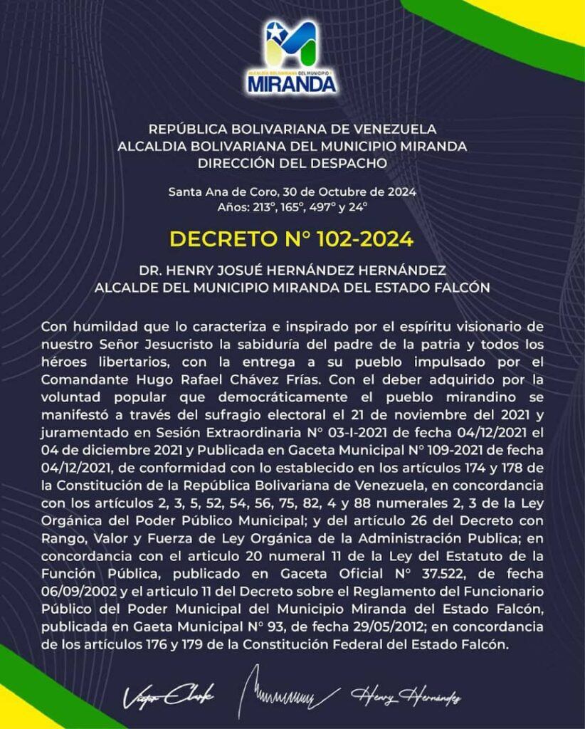 La alcaldía del municipio Miranda del estado Falcón, difundió este viernes una extensión del decreto 100-2024 que había aprobado el 30 de octubre con el fin de restringir la circulación nocturna de motos y crear condiciones para la disminución de accidentes y comisión de faltas de 9:00 de la noche a 5:00 de la mañana