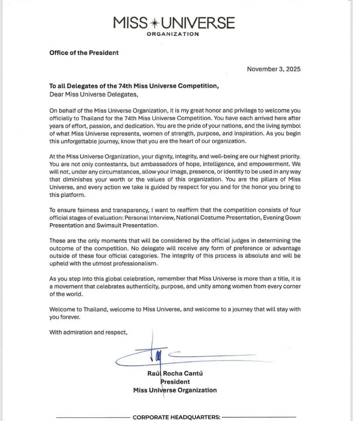 El inicio de la concentración de Miss Universo 2025 se ha visto envuelto en controversia tras una confrontación entre la representante de México, Fátima Bosch, y el empresario tailandés Nawat Itsaragrisil, director ejecutivo de la organización Miss Universe y también presidente de la organización Miss Grand International y director nacional de Miss Universe Tailandia.