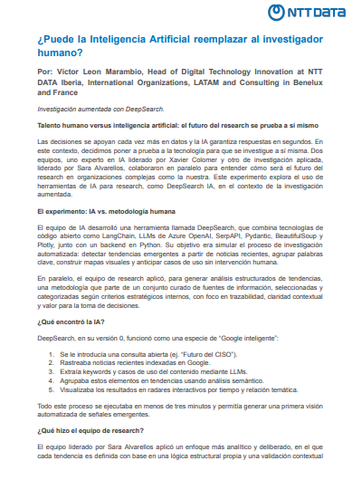 En un entorno donde la información digital crece a un ritmo vertiginoso, la pregunta sobre si la Inteligencia Artificial (IA) puede reemplazar al investigador humano es cada vez más relevante. Sin embargo, la empresa de tecnología global NTT DATA propone una visión diferente: la IA como el aliado indispensable que potencia la capacidad analítica humana. La compañía presentó su nuevo artículo, “DeepSearch: descubriendo valor oculto en la información no estructurada”, detallando cómo las organizaciones pueden transformar el caos de los datos dispersos en conocimiento estratégico.