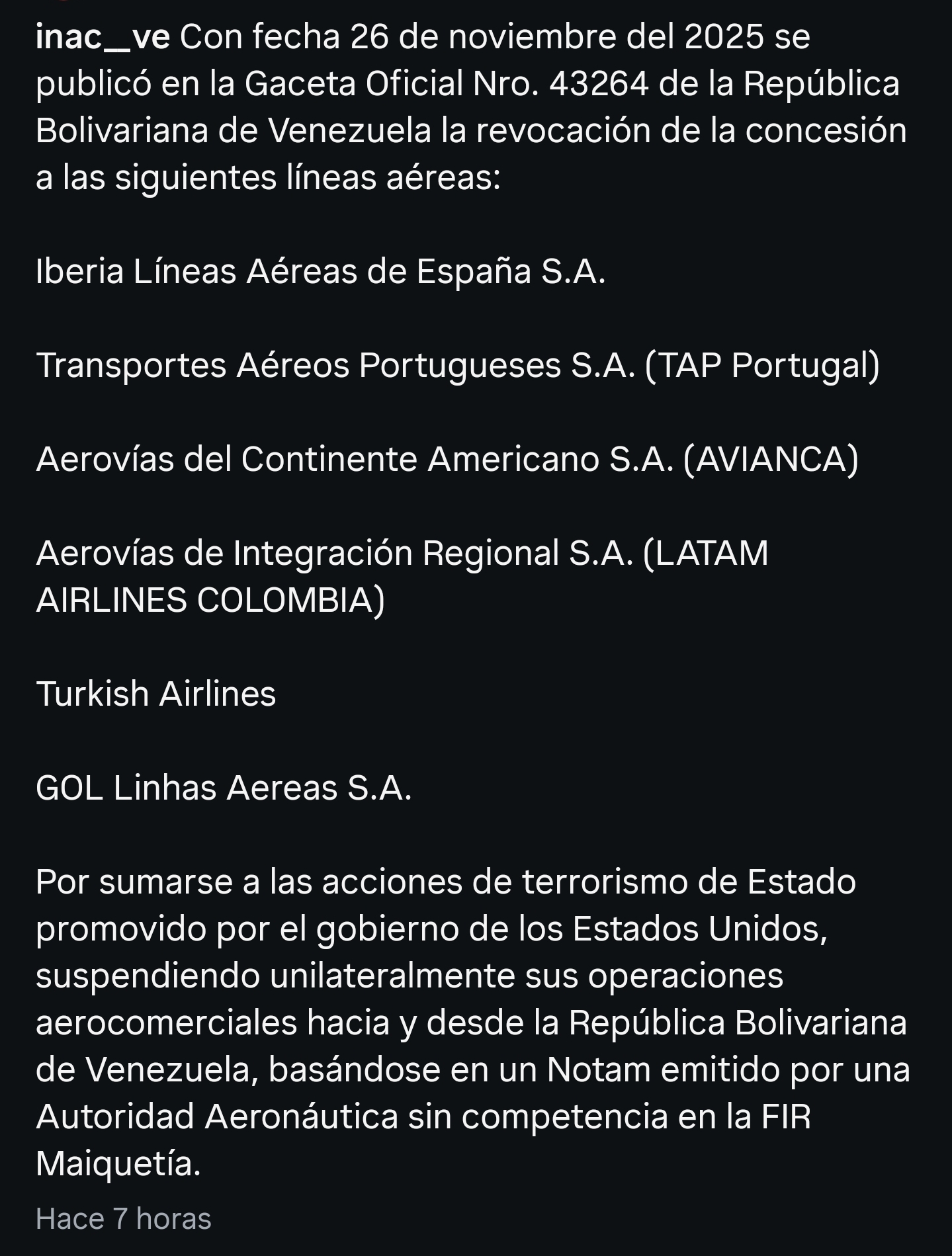 La institución anunció, mediante un comunicado colgado en redes sociales, la madrugada de este jueves 27 de noviembre de 2025 la suspensión definitiva de operaciones para las siguientes compañías, que ya habían cesado o reprogramado sus vuelos a Venezuela: