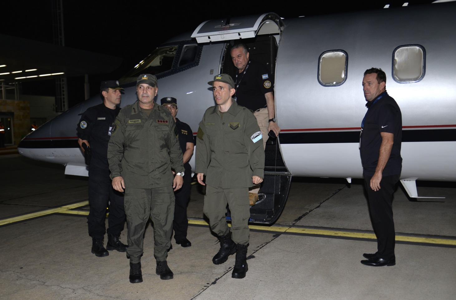 En la terminal aérea, una comitiva oficial integrada por la ministra de Seguridad, Alejandra Monteoliva; la senadora Patricia Bullrich; el canciller Pablo Quirno y el gobernador de Catamarca, Raúl Jalil, recibió al efectivo.